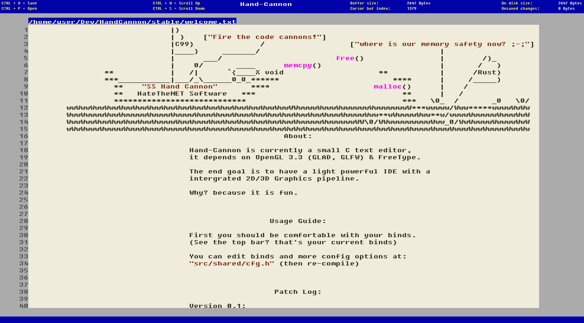 Hand Cannon was started because I was curious about how text editors handle editing large files. I researched different techniques like the piece table and gap buffer and tried to implement one, I chose the gap buffer because of the simplicity.